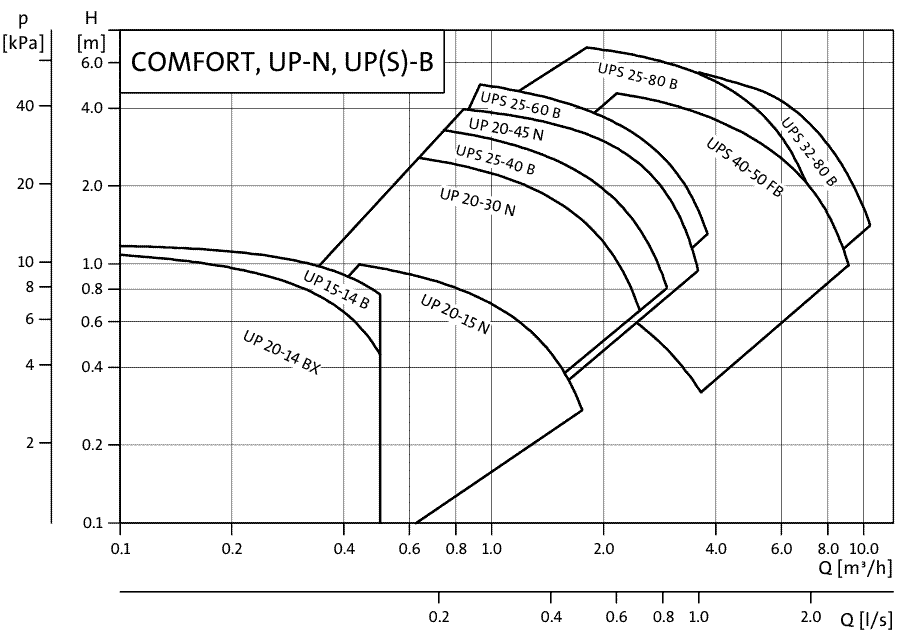 Насосы типа UPS применяются в центральных и районных системах отопления. Насосы типа UPS имеют три ступени частоты вращения. В основном, эти насосы используются в одно- и двухтрубных системах отопления, однако они также пригодны, например, для смесительных контуров в больших системах. Для систем типа «теплый пол» рекомендуется применять насосы в бронзовом исполнении (тип UP(S)B), поскольку перекачиваемая жидкость нередко содержит газ, что вызывает коррозию корпуса насоса, если он выполнен из чугуна.