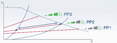 Режим пропорционального давления имеет 3 варианта рабочей характеристики (PP1, PP2, PP3), выбор которых определяется потребностями системы. Графики различных вариантов рабочих характеристик для данного режима приведены на рисунке.