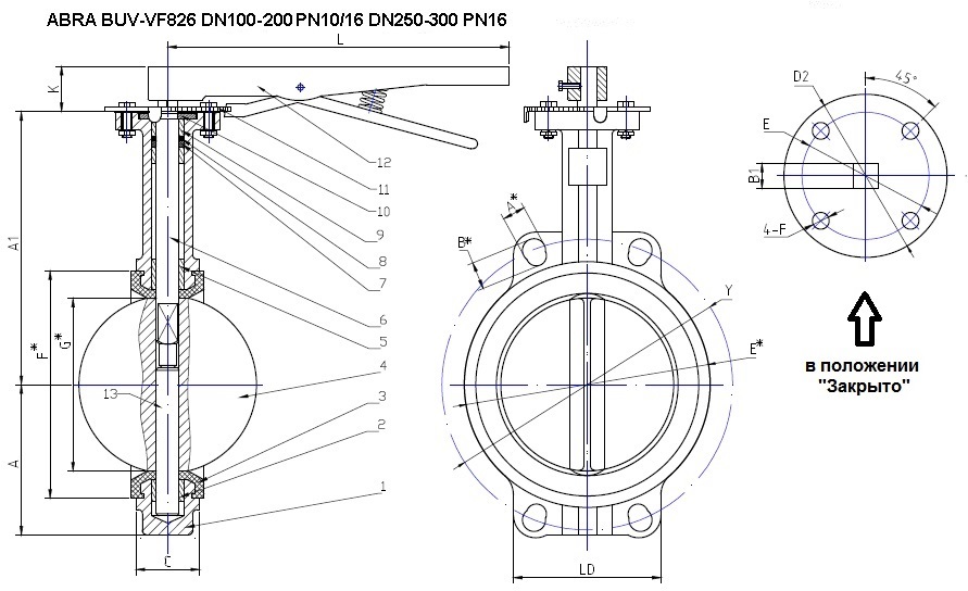 Спецификация деталей и материалов затвора поворотного дискового чугунного ABRA-BUV-VF826Dxxx Ду32-150 Ру 10/16, Ду200-300 Ру16 межфланцевого :