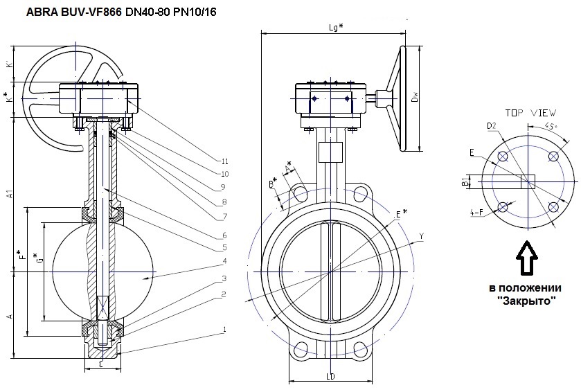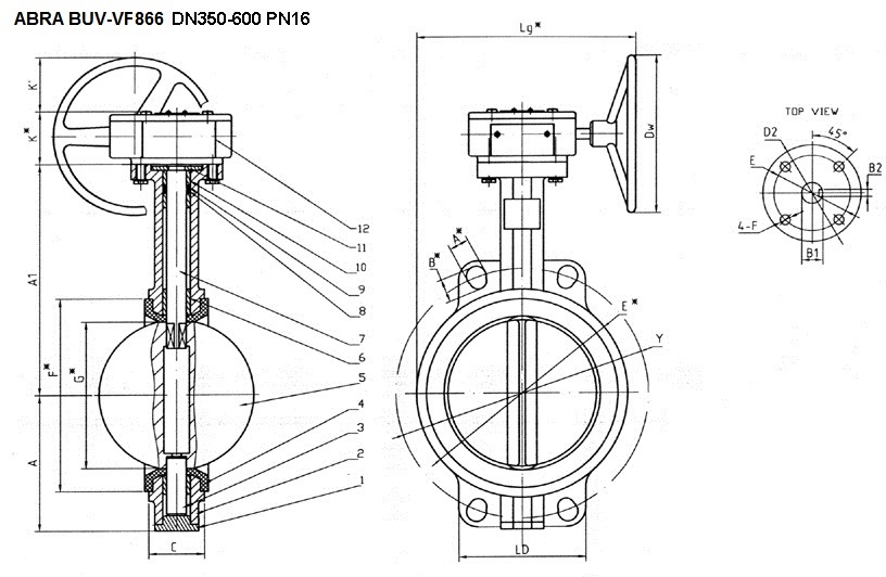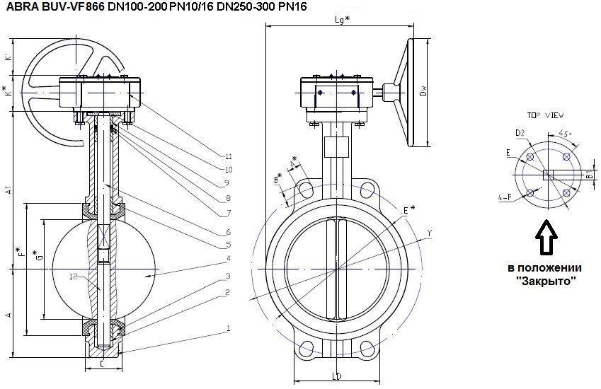 Чертеж габаритный затвора поворотного дискового чугунного межфланцевого ABRA-BUV-VF866DxxxG с редуктором: